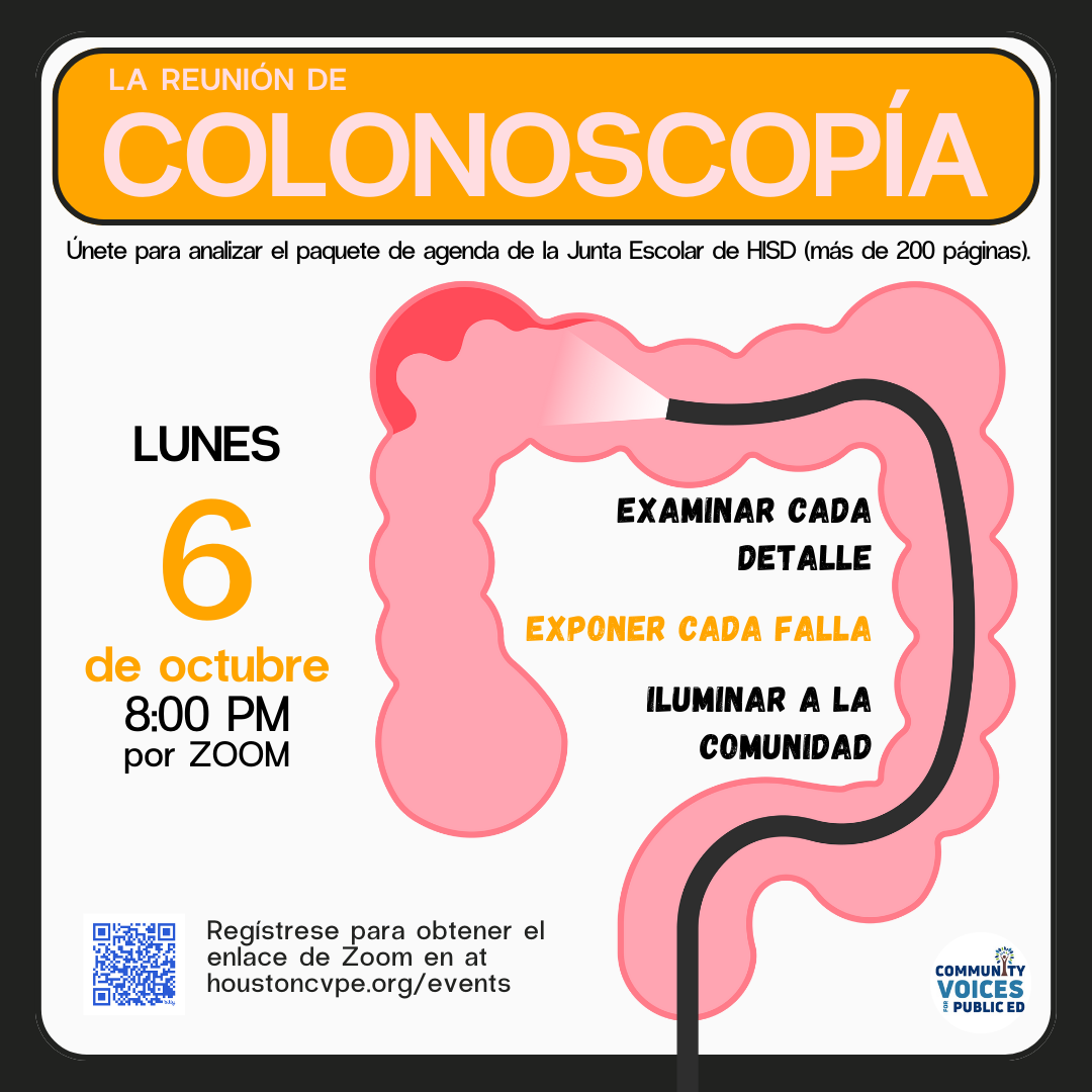 Ya sea que seas un defensor con experiencia o nuevo en hablar en las reuniones de la Junta, esta sesión te proporcionará el conocimiento y las estrategias necesarias para redactar discursos informados e impactantes. Asegurémonos de que tu voz sea escuchada y de que responsabilicemos a la Junta de HISD por sus decisiones.
