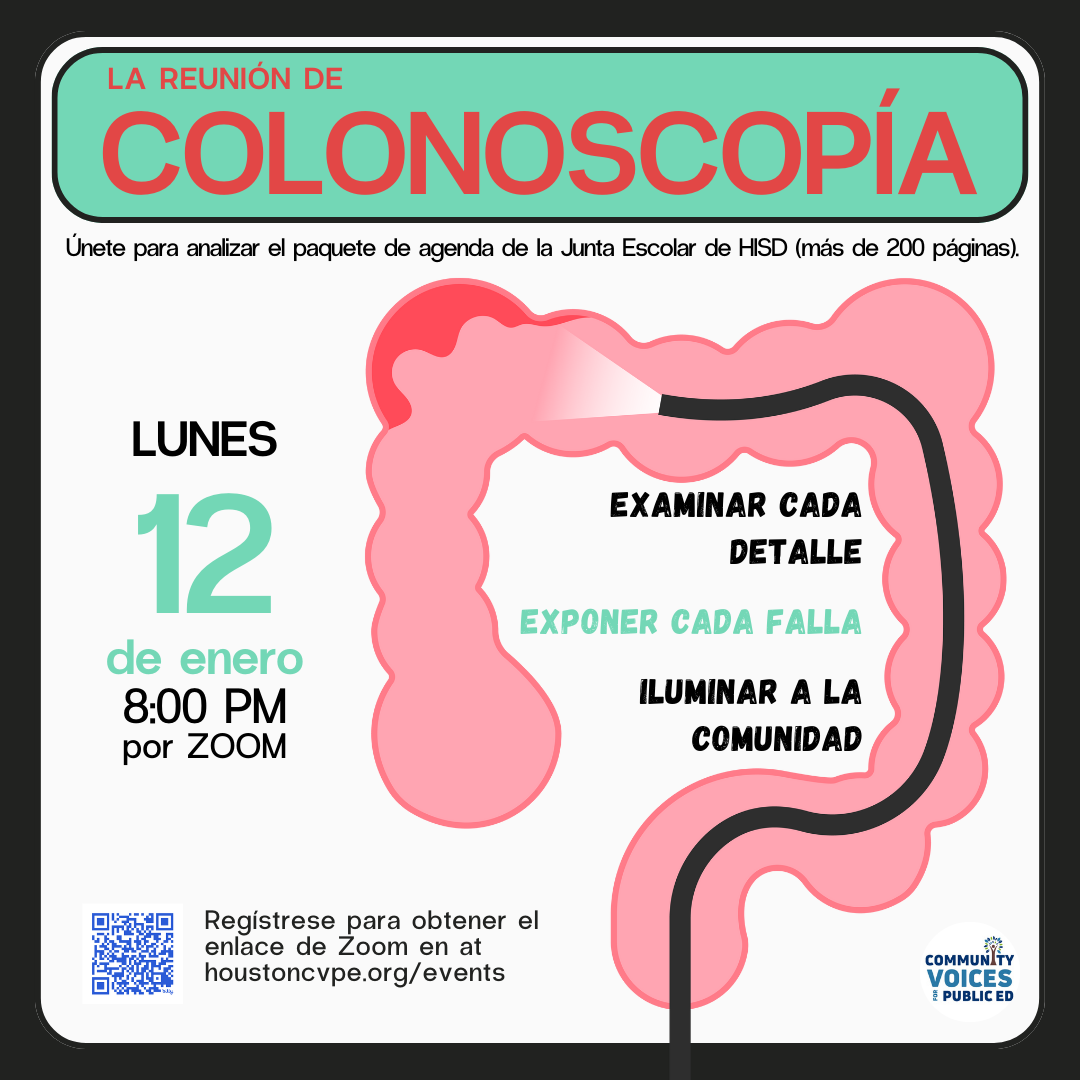 Ya sea que seas un defensor con experiencia o nuevo en hablar en las reuniones de la Junta, esta sesión te proporcionará el conocimiento y las estrategias necesarias para redactar discursos informados e impactantes. Asegurémonos de que tu voz sea escuchada y de que responsabilicemos a la Junta de HISD por sus decisiones.