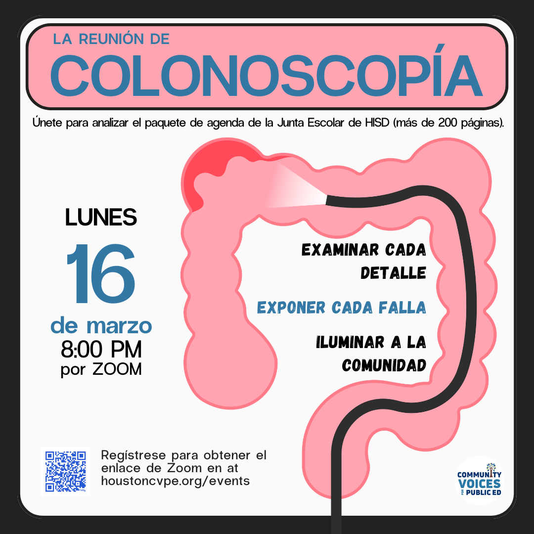 Ya sea que seas un defensor con experiencia o nuevo en hablar en las reuniones de la Junta, esta sesión te proporcionará el conocimiento y las estrategias necesarias para redactar discursos informados e impactantes. Asegurémonos de que tu voz sea escuchada y de que responsabilicemos a la Junta de HISD por sus decisiones.