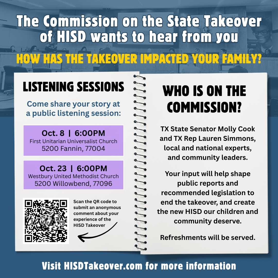 speak at Wednesday’s Commission or Thursday’s Board meeting. Our voices and votes can turn HISD around.