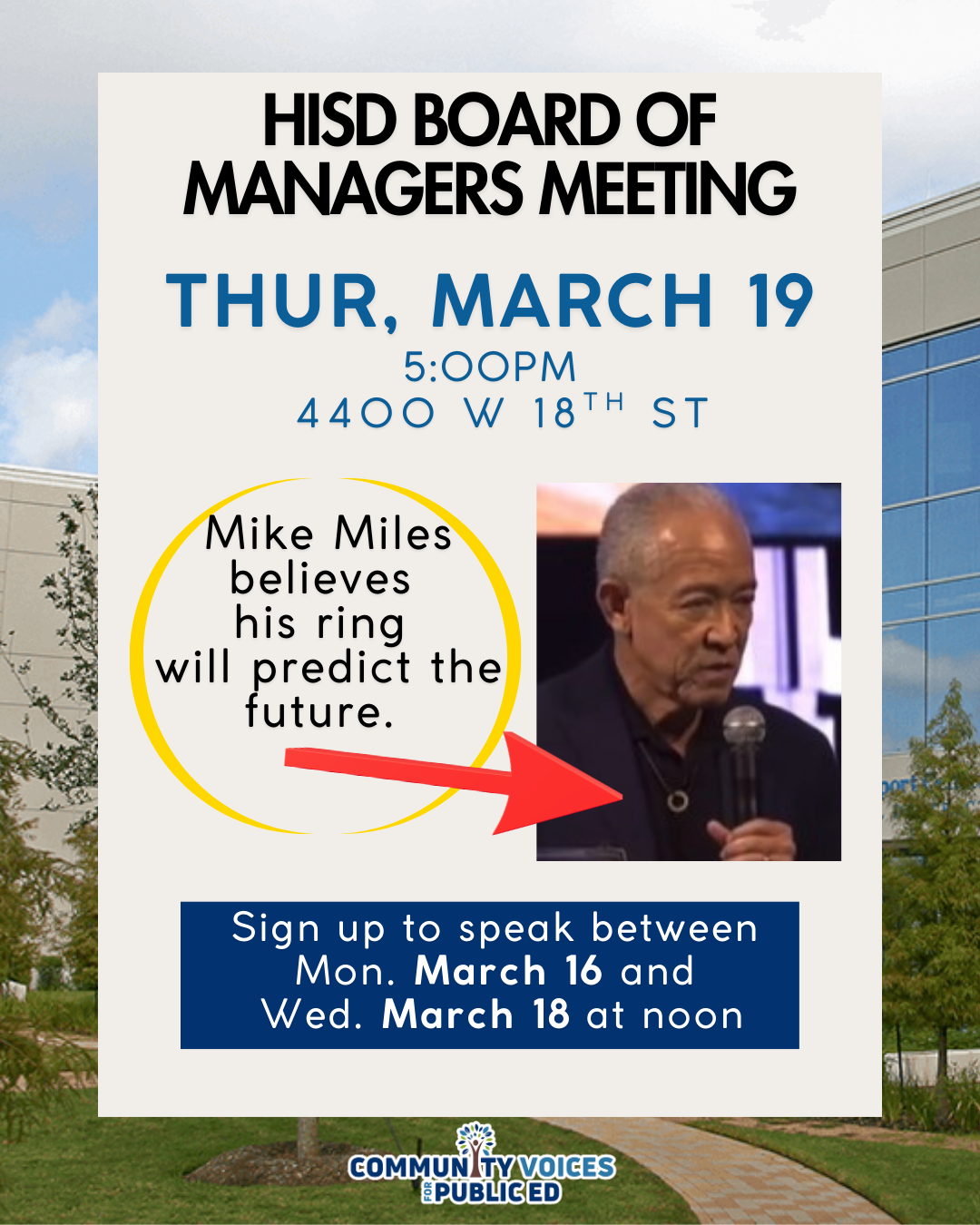 Will you sign up to speak at the Board Meeting? Miles is not listening, but the world is! You must register on HISD’s website by noon on Wednesday. Here are step-by-step instructions.