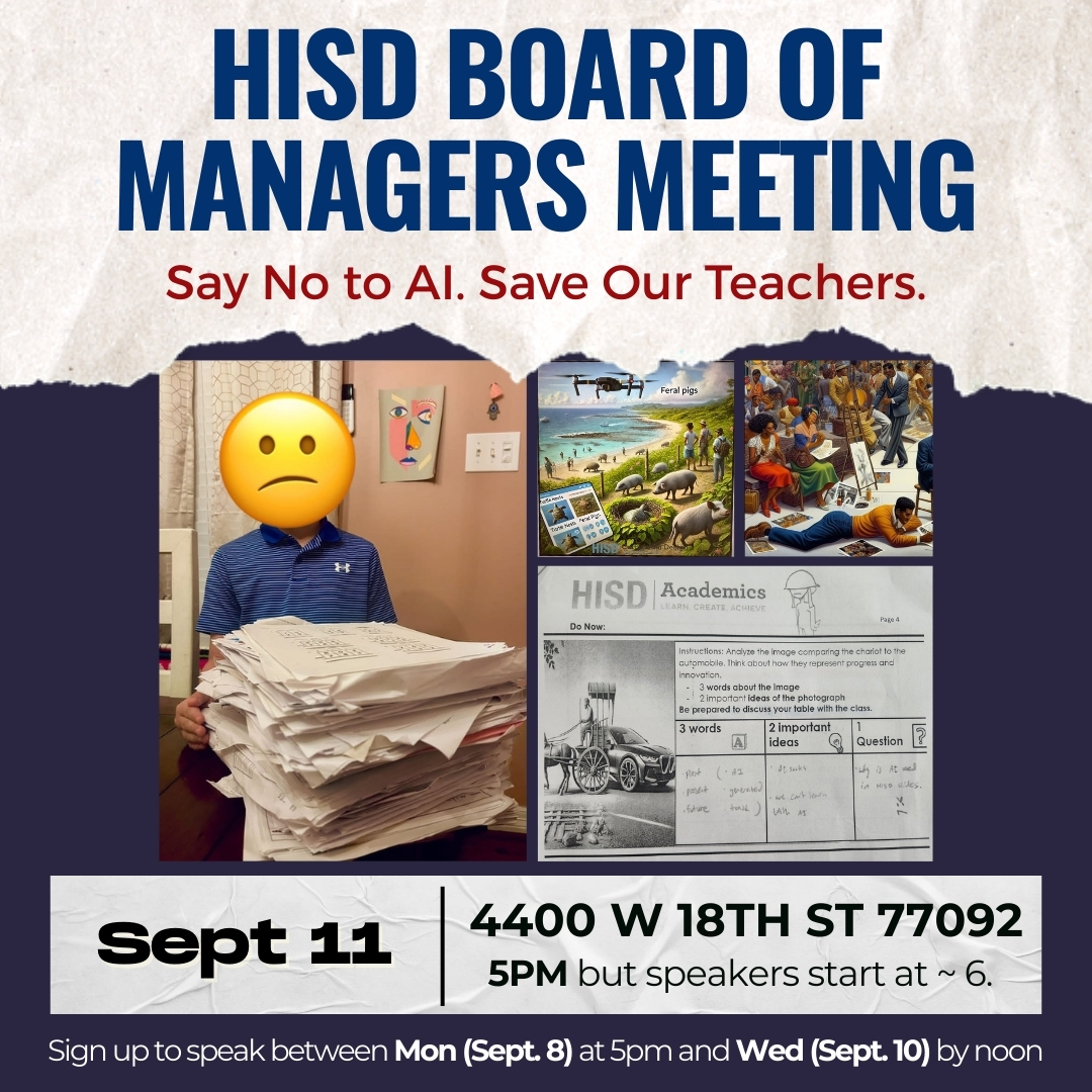 Also, plan to attend the Thursday, September 11 Board Meeting to continue speaking out for real learning in HISD.