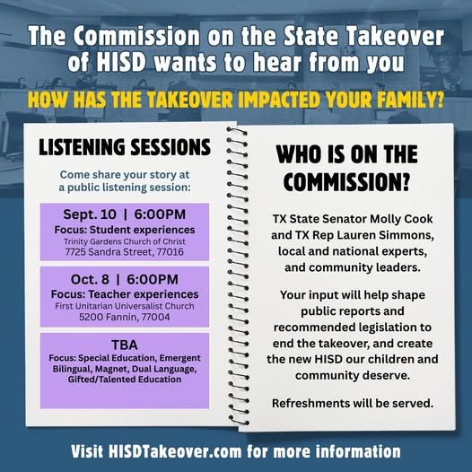 Can you speak up next Wednesday at the first listening session of the Commission on the State Takeover of HISD?