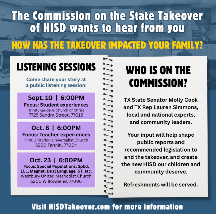 WEDNESDAY (9/10) – HISD State Takeover Commission Listening Session #1: 6–7:30 pm at Trinity Gardens Church of Christ, 7725 Sandra St. Speakers have two minutes each to share their story on any takeover-related topic. RSVP optional. There are a total of three listening sessions. See updated flyer above.
