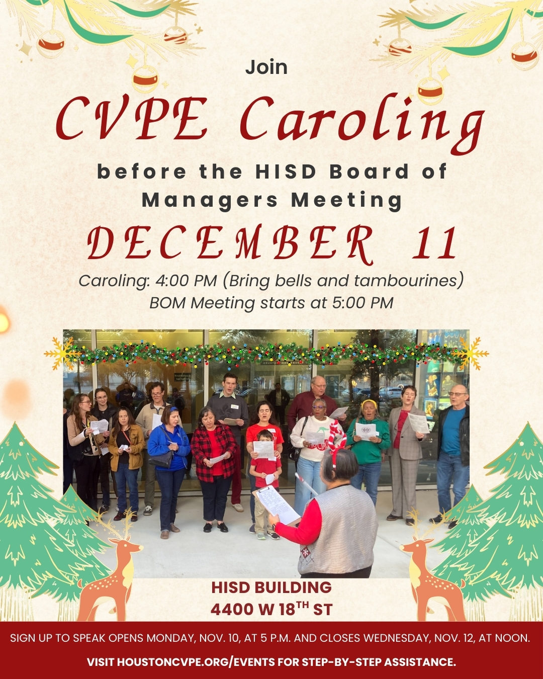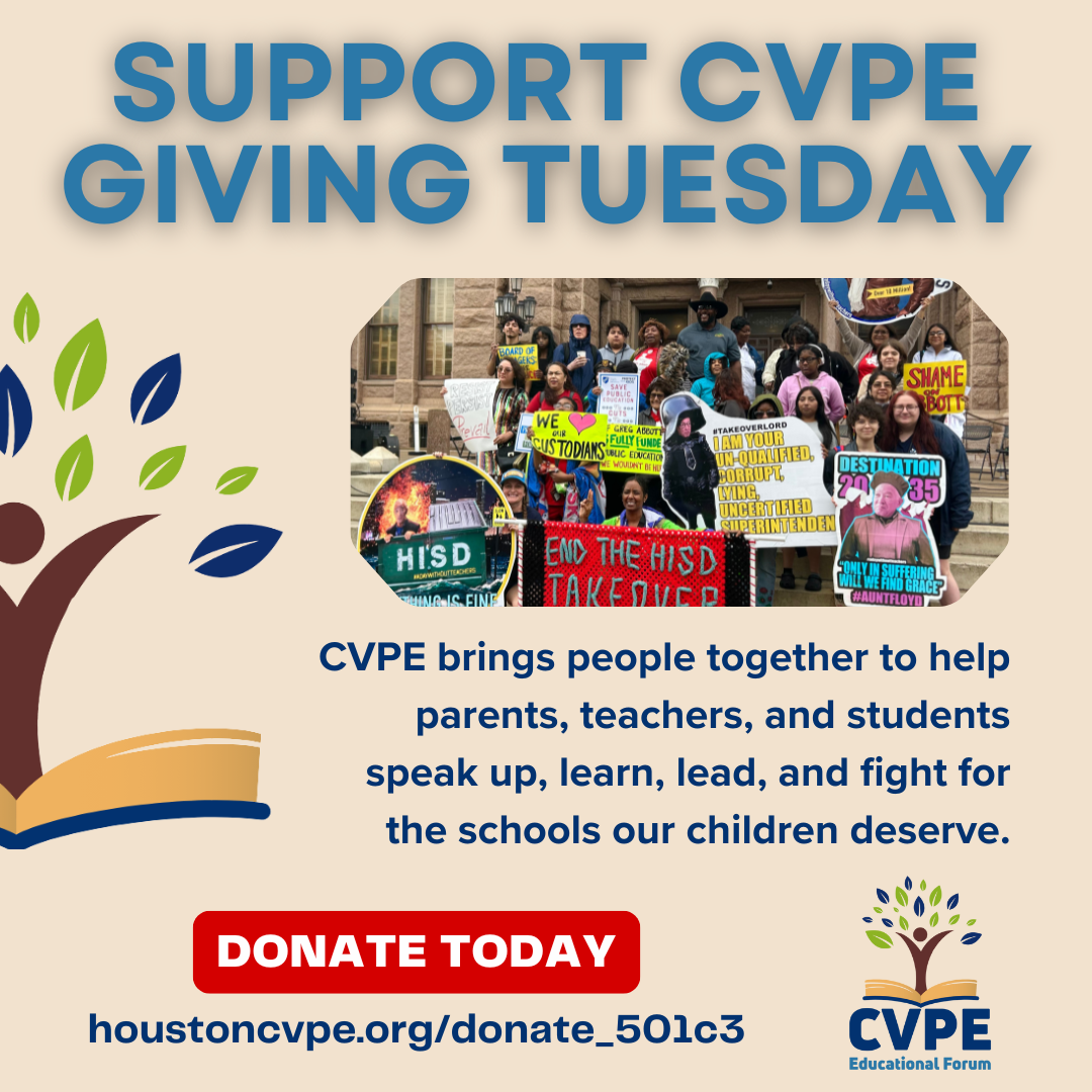If you missed our Giving Tuesday email, please consider supporting our work. This year, CVPE trained hundreds of parents, students, and educators; organized dozens of campus meetings and listening sessions; supported families navigating takeover-related disruptions; and mobilized hundreds across Houston to end the harmful takeover.