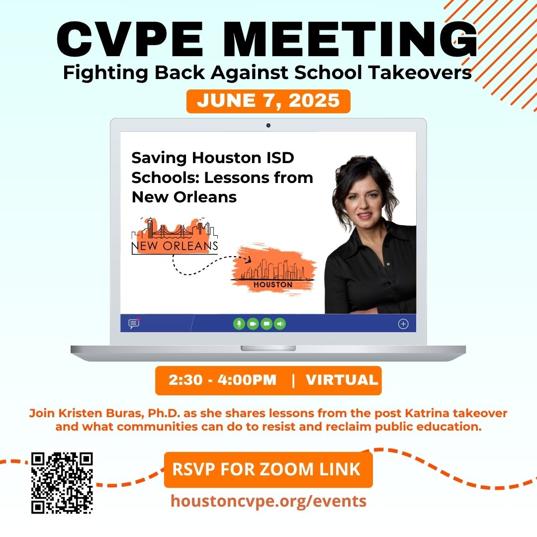 Join us for our monthly meeting on Saturday, June 7 at 2:30 PM via Zoom. We will discuss updates on HISD and feature a special guest, Dr. Kristen Buras.