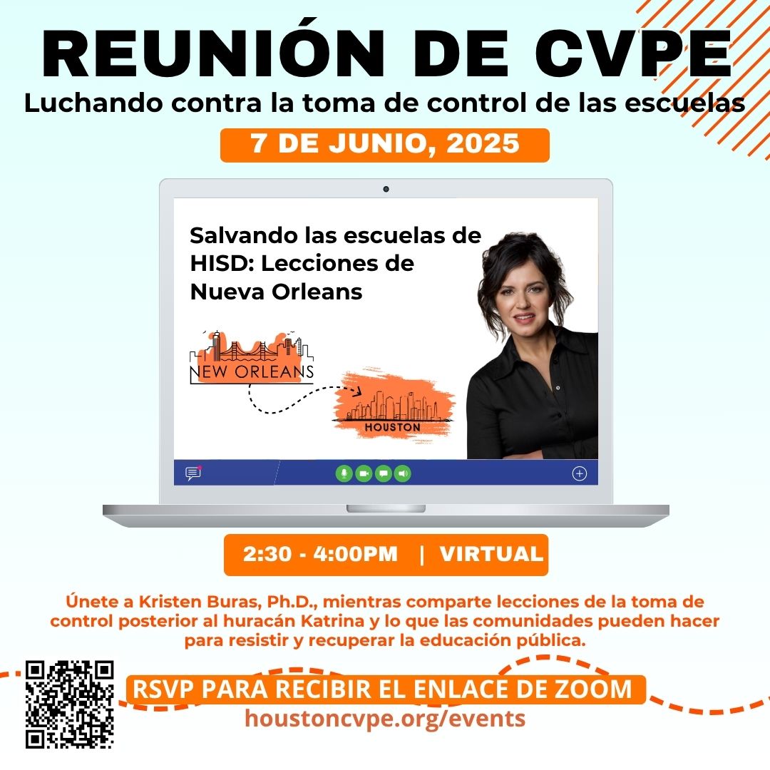 Únete a nuestra reunión mensual el sábado 7 de junio a las 2:30 PM por Zoom. Hablaremos sobre las actualizaciones de HISD y contaremos con una invitada especial, la Dra. Kristen Buras.