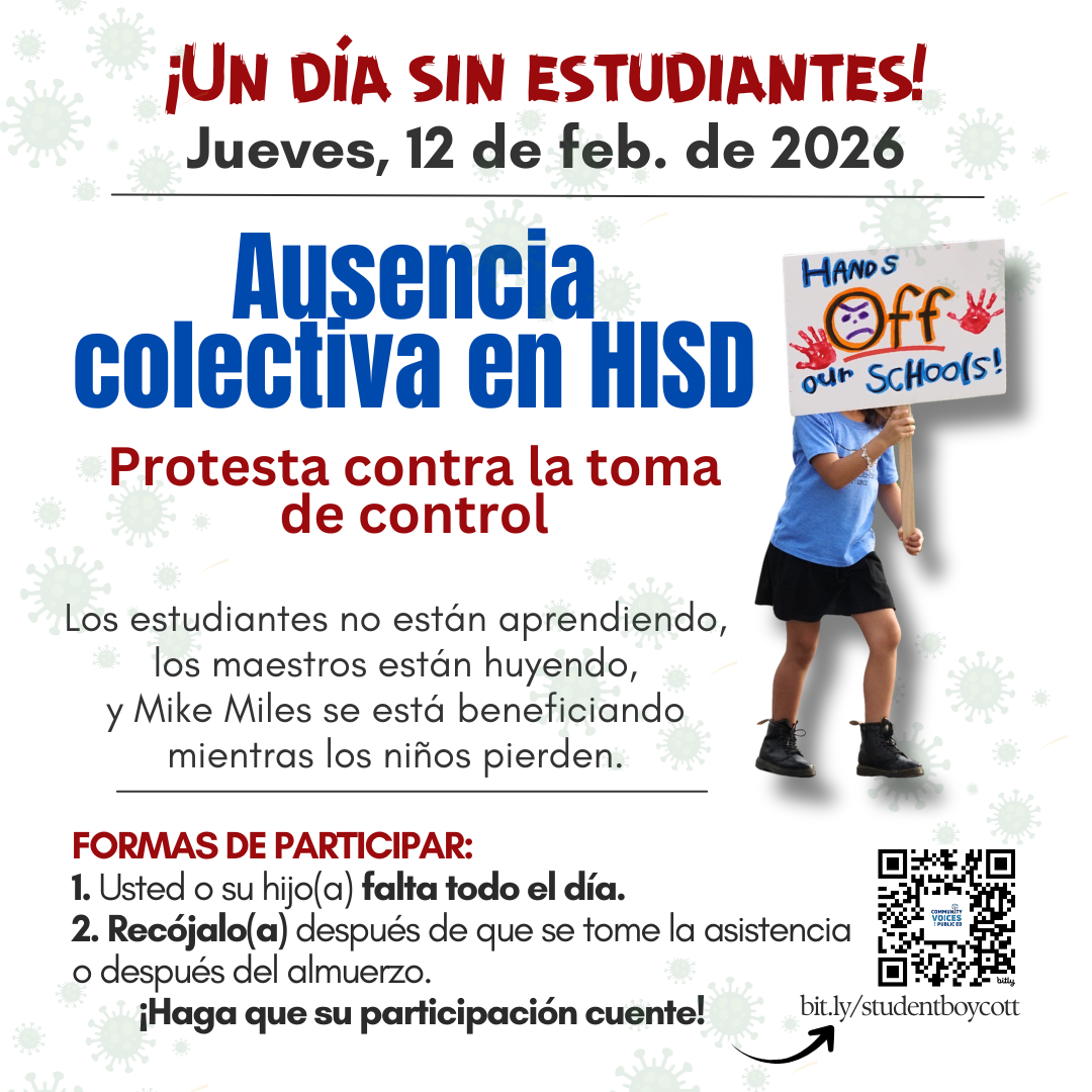 Parents across HISD are boycotting school on Thursday, Feb. 12 to protest the harmful state takeover. Teachers pushed out, students left behind while Mike Miles cashes in. Join and spread the word.